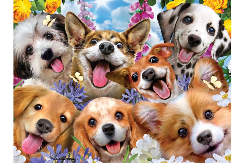 3D puzzle s motivem smějících se štěňátek.