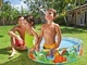 Dětský bazén s rozměry Ø 122 × 25 cm a pevnými, průhlednými plastovými bočními stěnami s veselým potiskem zvířecích motivů.