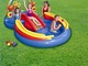 Tady se jde rovnou na věc! Hrací centrum značky INTEX o rozměrech 297 × 193 × 135 cm nabízí vše, co si děti přejí. 2 bazény, různé hry s míči a kroužky, duhovou sprchu s připojením na zahradní hadici, skluzavku – to vše rozdělené do 2 různých bazénů.
