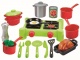 Dvouplotýnkový vařič se sadou hrnců s pokličkami, rendlíky, pánvičkou, pekáčem, potravinami a dalším příslušenstvím.