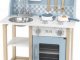 Dřevěná kuchyňka modrá se sporákem, troubou a dřezem.