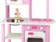 Dřevěná kuchyňka, která je laděná do bílé a růžové barvy je připravena pro holčičky, které rády připravují jídlo, třeba pro panenky.