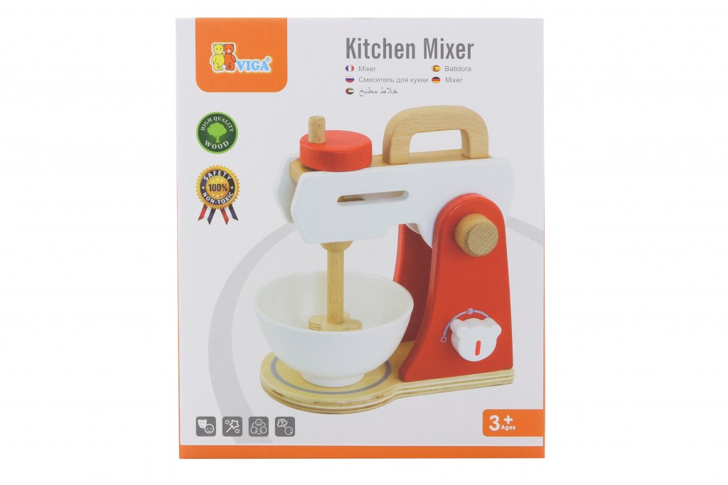 Dřevěný mixér o velikosti cca 21 × 21 × 11 cm.