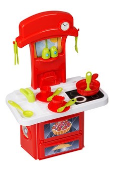 Tato kuchyňka v atraktivním pistáciovém designu má dvě poličky, otvírací dvířka k troubě, mikrovlnce i skříňce pod dřezem, otočné knoflíky u varné desky i u dřezové baterie.