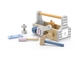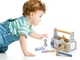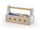 Dřevěná basa s nářadím obsahuje šroubovák, kladívko, klíč, šrouby, matice a destičky pro šroubování.