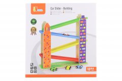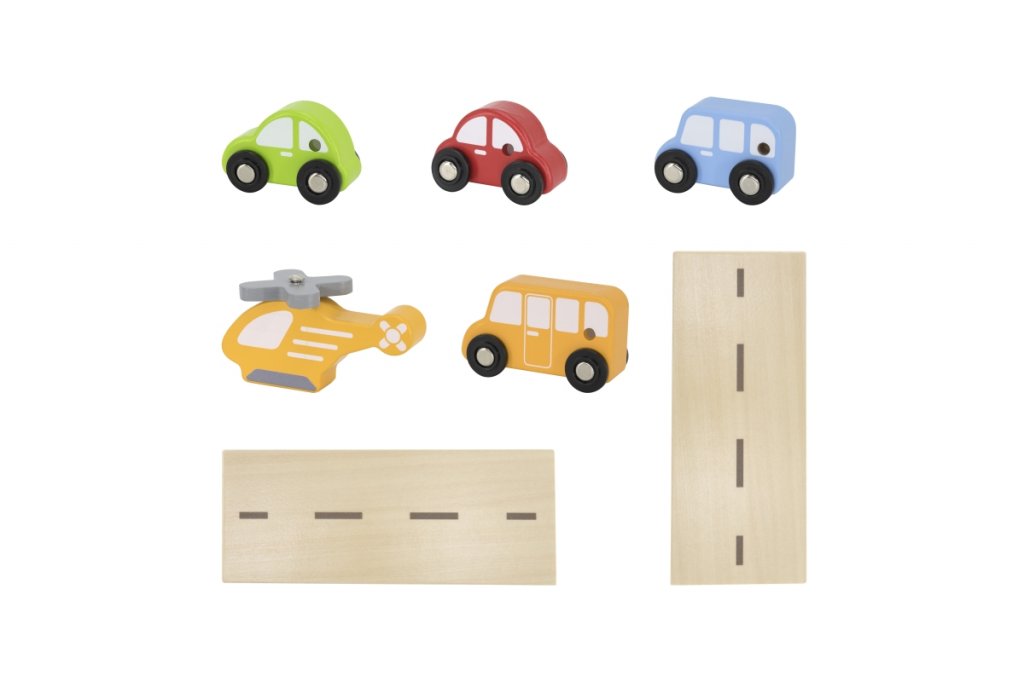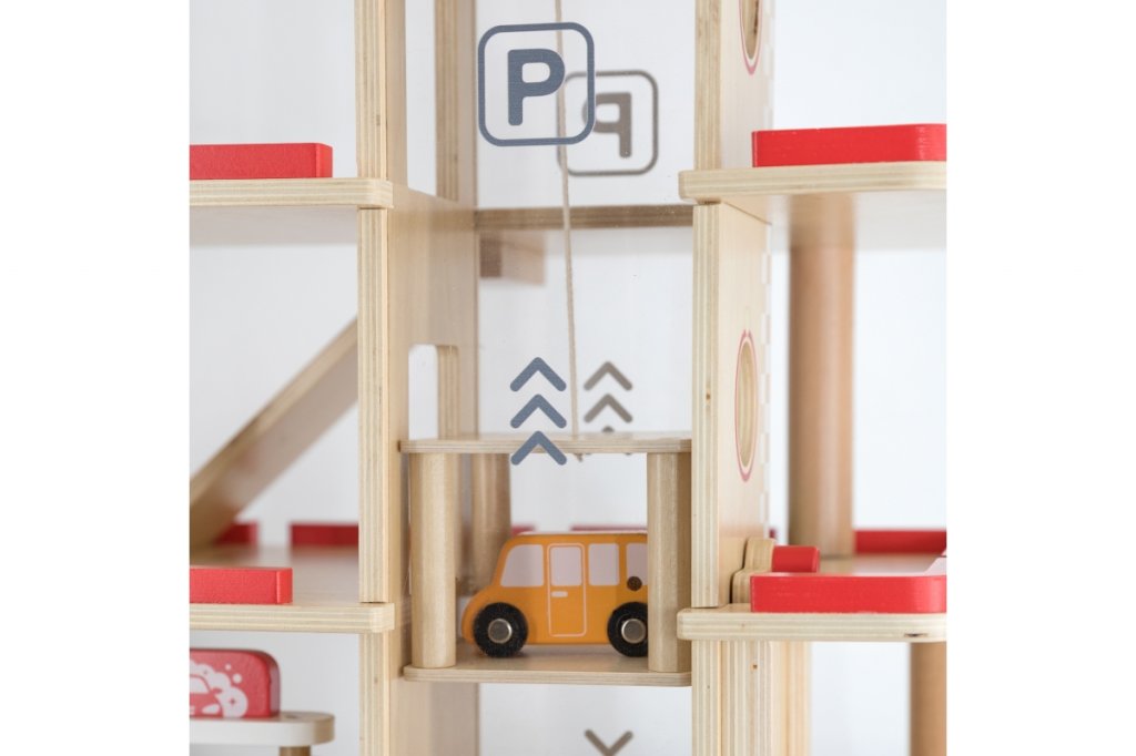 Součástí balení 4 autíčka a helikoptéra, heliport, výtah, myčka.