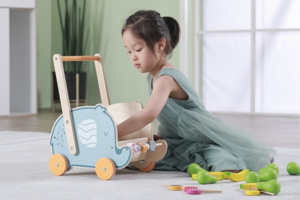 Dřevěné chodítko s herními prvky pro rozvíjení dětské chůze a motoriky.