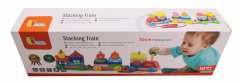 Dřevěný vláček skládačka v pastelových barvách o rozměru cca 41 × 12 × 8 cm.