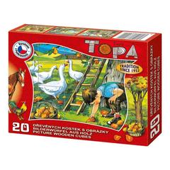 Kvalitní dřevěné kostky 20 kusů, ze kterých složíte 6 obrázků z pohádky Sněhurka a sedm trpaslíků.