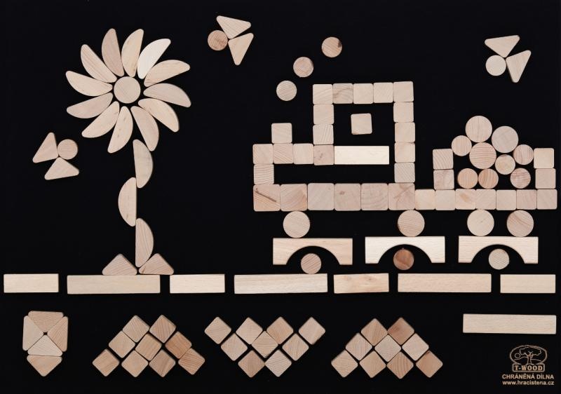 Hrací stěna se skládá z plstěné tabule o rozměrech 70×50 centimetrů a 125 kusů skládacích dílků různých tvarů z kvalitního bukového dřeva.