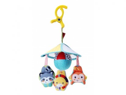 Kolotoč s roztomilými zvířátky se snadno připevní na kočárek či autosedačku s pomocí velkého klipu.