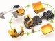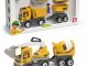 Sada obsahuje jedno auto, 2 Igráčky stavbaře a 4 korbičky: bagr, domíchávač, sklápěčku a valníček.