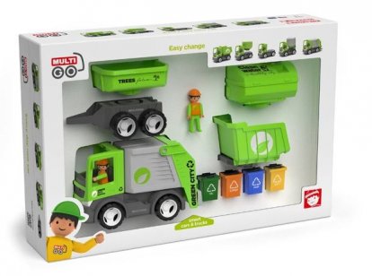 Sada obsahuje: 2 Igráčky, 4 popelnice, jedno auto, přívěs a 4 korbičky: sklápěčku, valník, cisternu a popelářskou nástavbu.