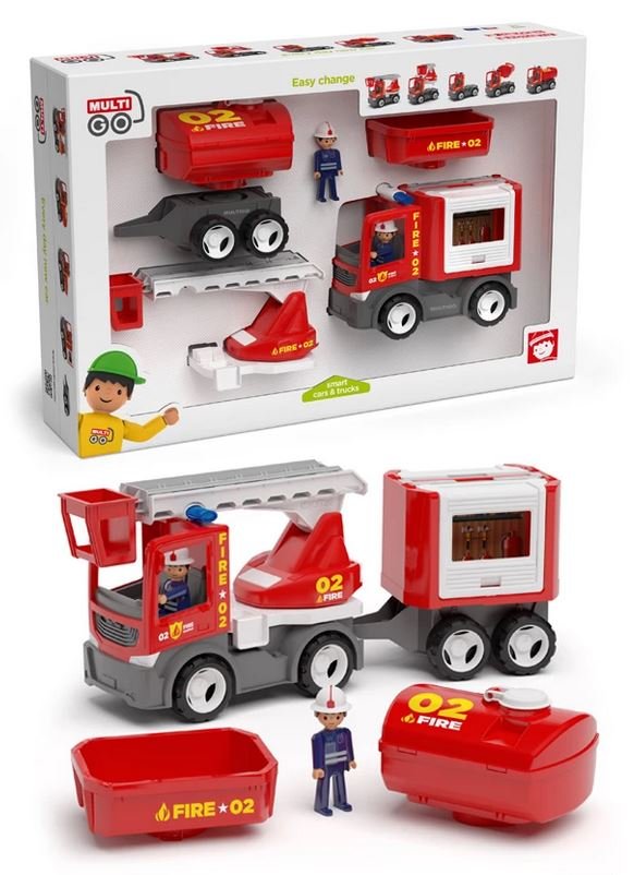Toto balení nabízí hned 4 typy hasičských vozidel pro různé zásahové situace. Obsahuje jedno auto, 4 vyměnitelné korbičky: hasičský žebřík, cisternu, valník, multikorbičku s hasičským vybavením, přívěs a 2 Igráčky hasiče.