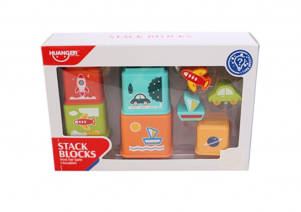 Balení obsahuje 5 barevných kelímků s obrázky a 3 dopravní prostředky na vkládání.