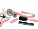 Sada pro kadeřnice v trendové šedo-růžové barvě obsahuje kulmu, fén na baterie s difuzérem, nůžky, hřebínek, kartáč, žehličku na vlasy, sponky, sprej na vlasy.