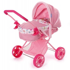 Klasický dětský kočárek pro panenky v růžové barvě s puntíky.