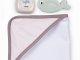 Polička nabízí dostatek místa pro uložení vloženého příslušenství: osušky z bavlněného froté, lahvičky na šampón s pumpovací funkcí a teploměru ve tvaru velryby.