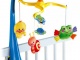Hudbení kolotoč nad postýlku s veselými plyšovými zvířátky.