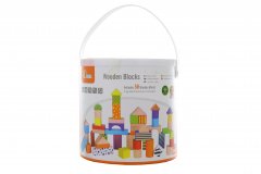 Inovovaná stavebnice skládající se z různých tvarů a velikostí dřevěných dílků v zeleno-přírodním barevném provedení.