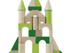 Inovovaná stavebnice skládající se z různých tvarů a velikostí dřevěných dílků v zeleno-přírodním barevném provedení.