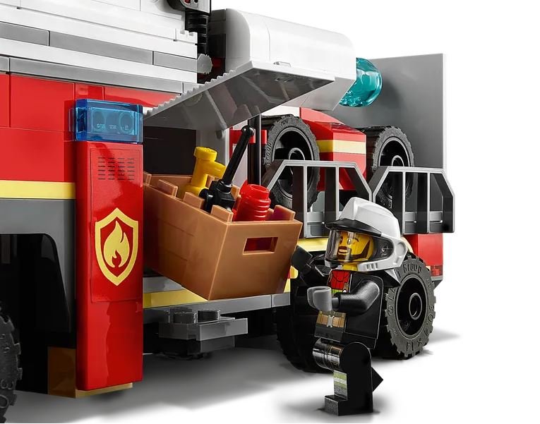 Vzrušující stavebnice Velitelská jednotka hasičů od LEGO City se může pochlubit klasickým hasičským autem s funkční vysokozdvižnou plošinou.