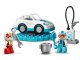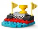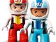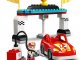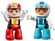 Součástí stavebnice jsou DUPLO figurky závodníka a závodnice s helmami, 2 auta s technologií Push-and-Go a doplňky, včetně trofeje, vlajek, nabíjecí stanice, kuželů a výbavy pro údržbu aut.