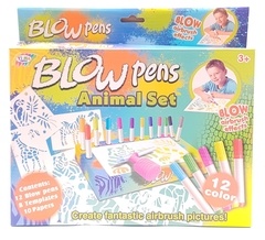 Velká sada foukacích fixů obsahuje lepenkový podstavec a držák na fixy, 12 barevných fixů, 8 šablon, 6 papírů a nástavec na foukání s pumpičkou.