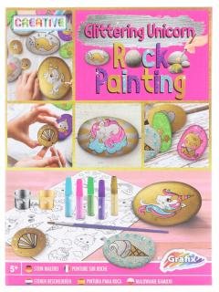Sada na malování kamínků obsahuje 4 kameny, 5 barev, 1 štětec, 2 třpytivé barvy v tubě, samolepky a návod.