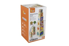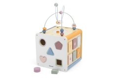 Dřevěná kostka s devíti různobarevnými vkládacími tvary, které odpovídají otvorům ve stěnách kostky.
