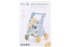 Dřevěné chodítko s herními prvky pro rozvíjení dětské chůze a motoriky.
