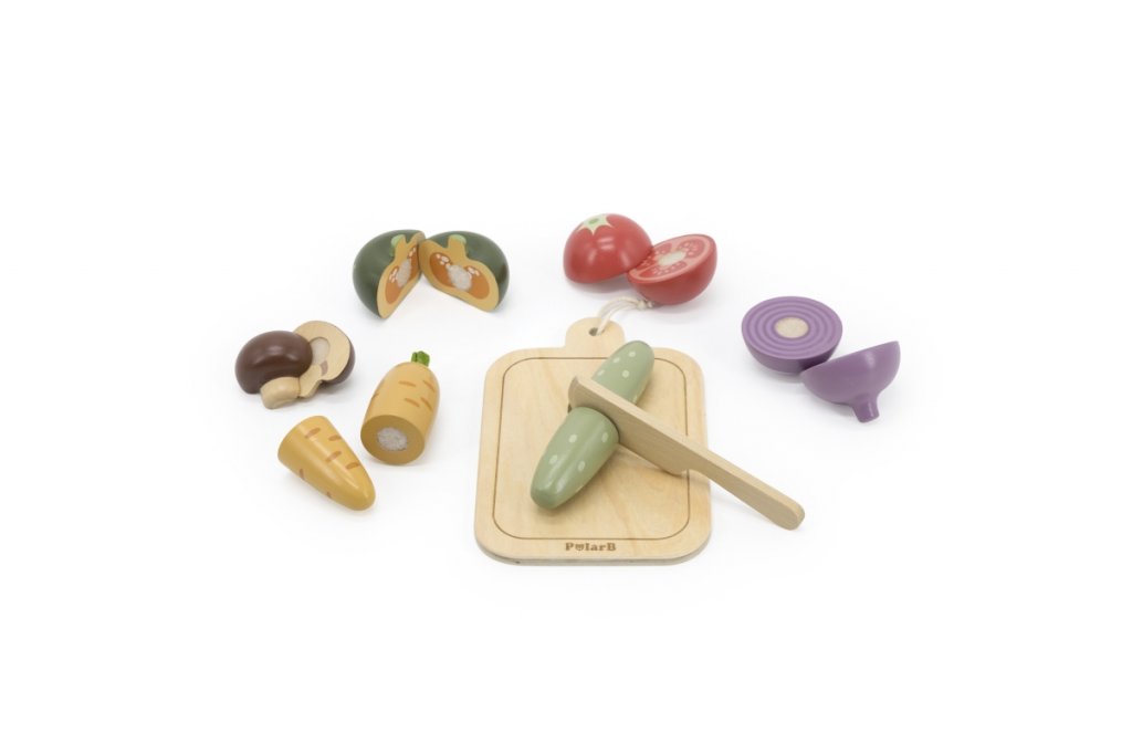 Balení obsahuje prkénko, nůž a 6 kusů různých druhů zeleniny.