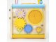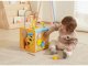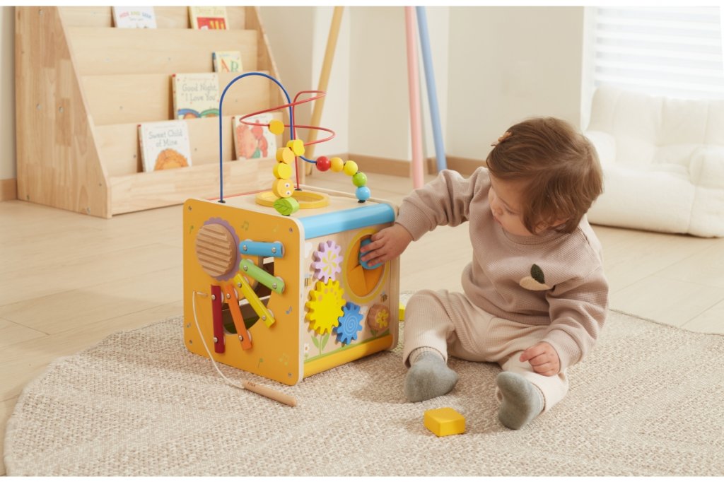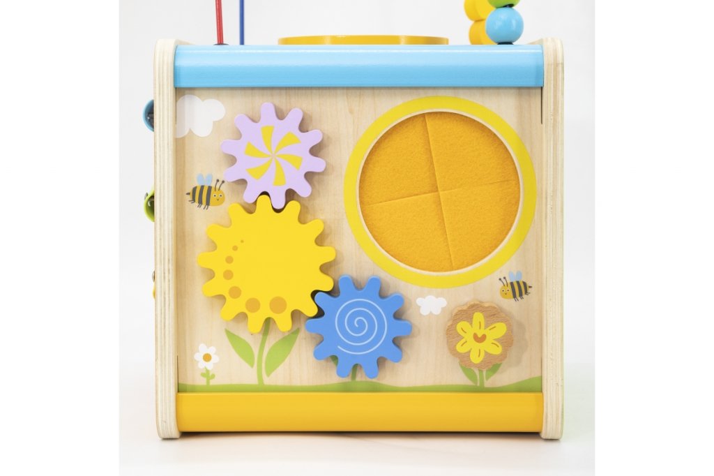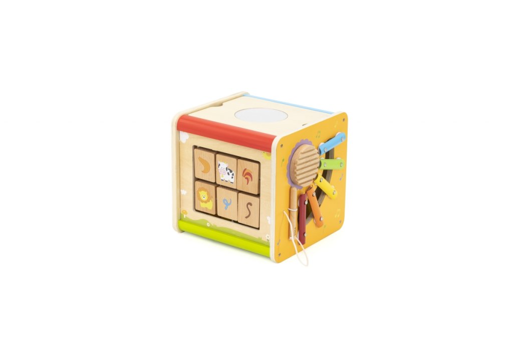 Box obsahuje xylofon, labyrint, stírací desku, překlápěcí kostky, tvary, tabulku na křídy, zrcadlo, ozubená kolečka, a tajemnou krabičku.