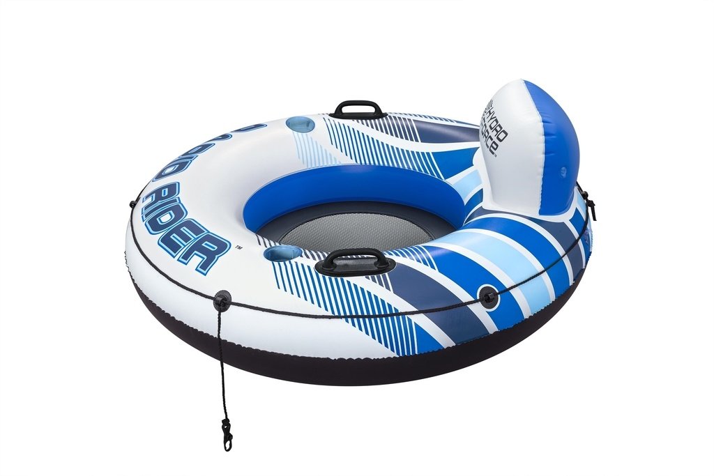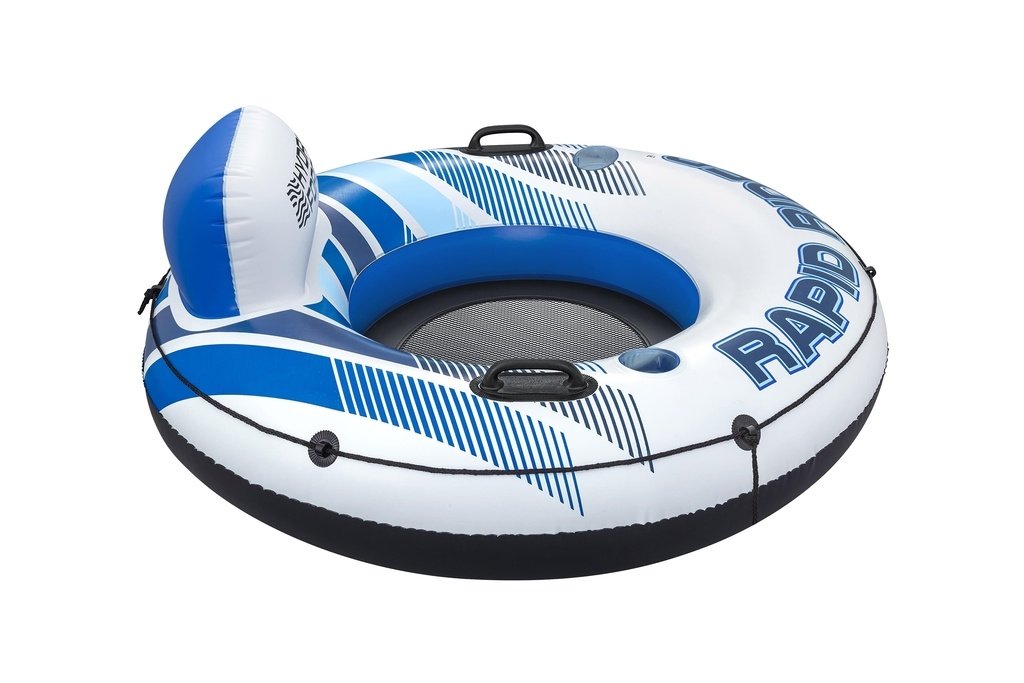 Tento nafukovací kruh je vyrobený z vysoce kvalitního vinylu a je velmi odolný. Spodní strana ze síťoviny vás ochladí a vestavěné opěradlo poskytuje skvělé pohodlí při sezení. Kruh je též vybavený dvěma držáky na nápoj, takže vám při odpočinku ve vodě nebude chybět potřebné osvěžení. Uchopovací lano kolem dokola s vestavěnými průchodkami usnadňuje nastupování a vystupování. Nafouknutí i vyfouknutí kruhu je snadné a rychlé.