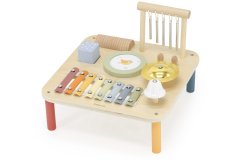 Dřevěný stolek s hudebními nástroji pro všechny hudební nadšence.