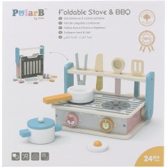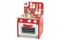 Dřevěná kuchyňka se sporákem, skříňkou a dřezem.