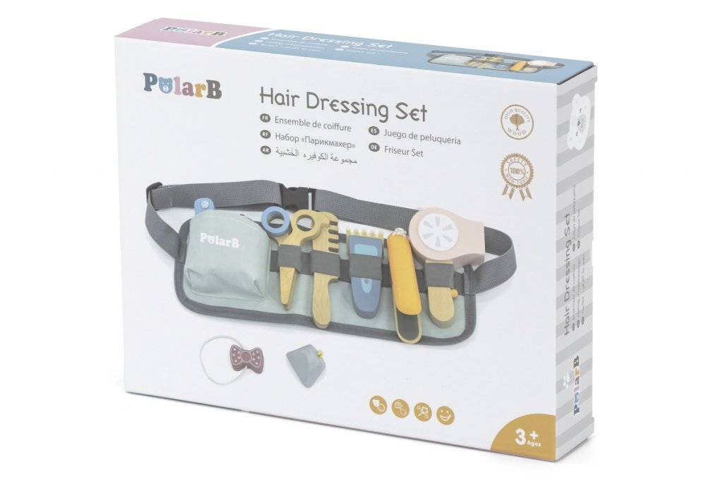 Dřevěná sada kadeřník s opaskem – obsahuje opasek,na který lze upevnit nůžky,hřeben, holicí strojek,fen,kulmu,gumičku s ozdobou,břitvu.
