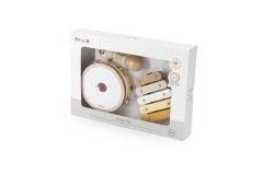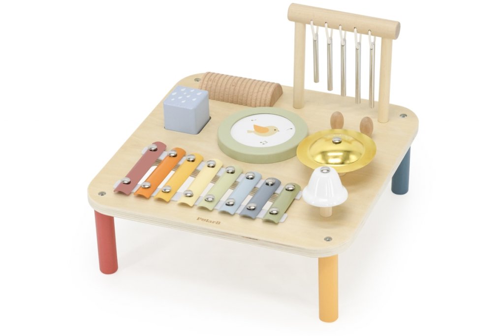Stolek obsahuje xylofon, hudební kostku, bubínek, zvonek, gong, zvonkohru a škrabací váleček.