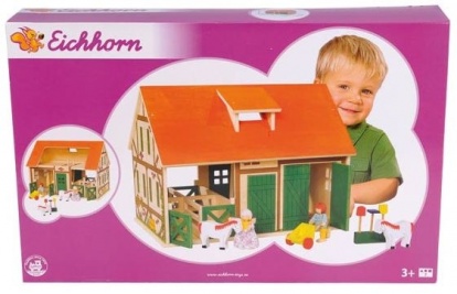Velká dřevěná koňská farma s garáží, koňmi, postavičkami a dalším příslušenstvím, které potřebuje malý farmář ke hraní. Rozměry cca 48×33×37 cm Věk: 3+