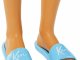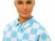 Panenka Ken má na sobě modrobíle kostkované tričko na knoflíky a k němu ladící blankytně modré plavky.