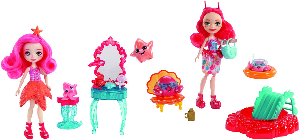 Všechny panenky Enchantimals z vodního světa mají krásné všívané vlásky, jemné obličejové rysy a obleček v zářivých barvách skládající se z odnímatelné sukýnky a tematických botek a čelenky.