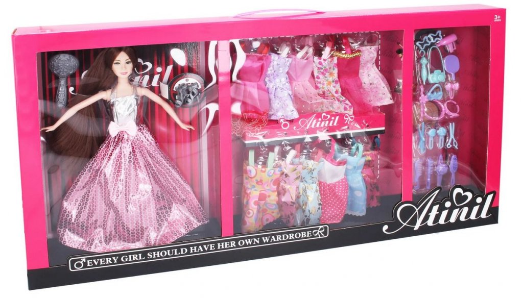 Obsah balení – panenka, hřeben, kartáč, šatník, boty, 12 druhů šatů, množství módních doplňků.