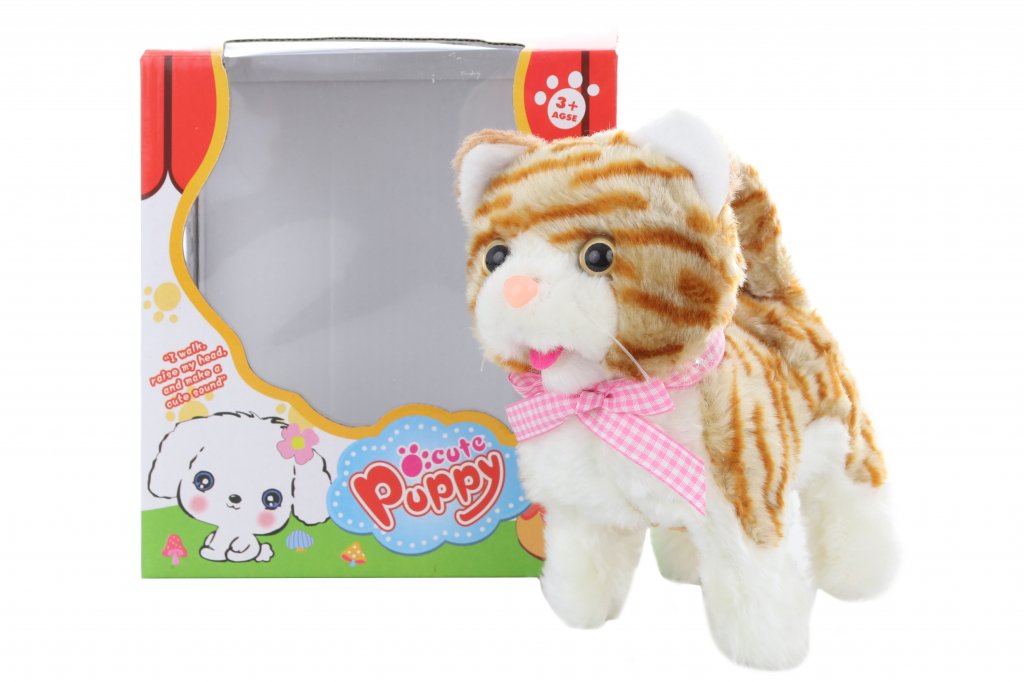 Zrzavá chodící kočička, která vydává zvuky a chodí.