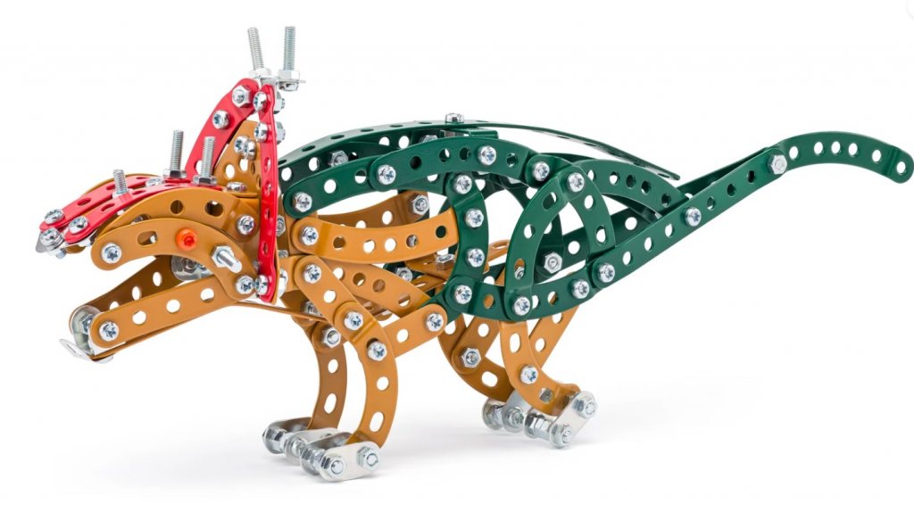 Kovový model dinosaura Diabloceratops Merkur obsahuje součástky nutné pro stavbu dinosaura. V balení najdete podrobný návod.