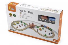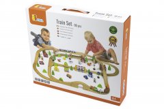 Balení obsahuje celkem 49 kusů – koleje, 2 lokomotivy, 4 vagóny, 3 autíčka a další doplňky.