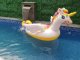 Nafukovací barevný jednorožec o velikosti 198 × 140 × 102 cm.