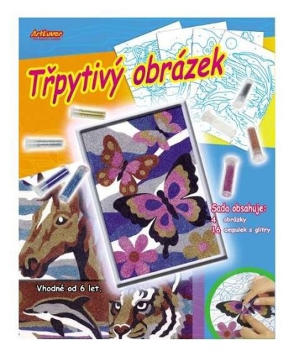 1. Opatrně odlepte jeden díl předražené folie. 2. Na vzniklou lepivou plochu nasypte třpytky. 3. Postup opakujte na celý obrázek. Sada obsahuje: 4 obrázky 16 ampulek s glitry.