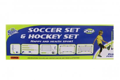 Balení obsahuje 1 hokejku, 2 puky, 16 dílků k sestavení branky+síť a 1 měkký fotbalový míč s pumičkou.